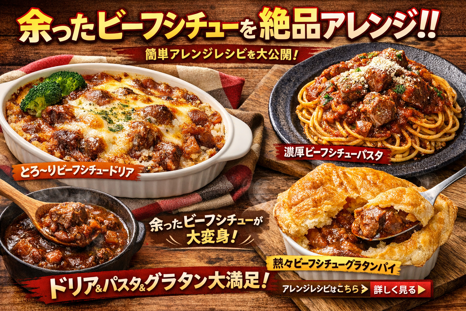 この記事では、残り物ビーフシチューを「状態別」に診断し、ドリア向き・パスタ向き・オムライス向きにまず分類します。そのうえで、