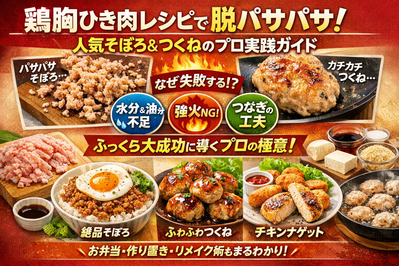 「鶏胸ひき肉 レシピ」で検索して、人気1位やクックパッド殿堂入りをむねミンチでそのまま作り、そぼろが砂のようにボソボソ、つくねが固くて子どもが残す、お弁当では冷めるとパサパサ。この繰り返しは、腕の問題ではなくレシピ側が「鶏胸ひき肉前提」になっていない構造的欠陥です。