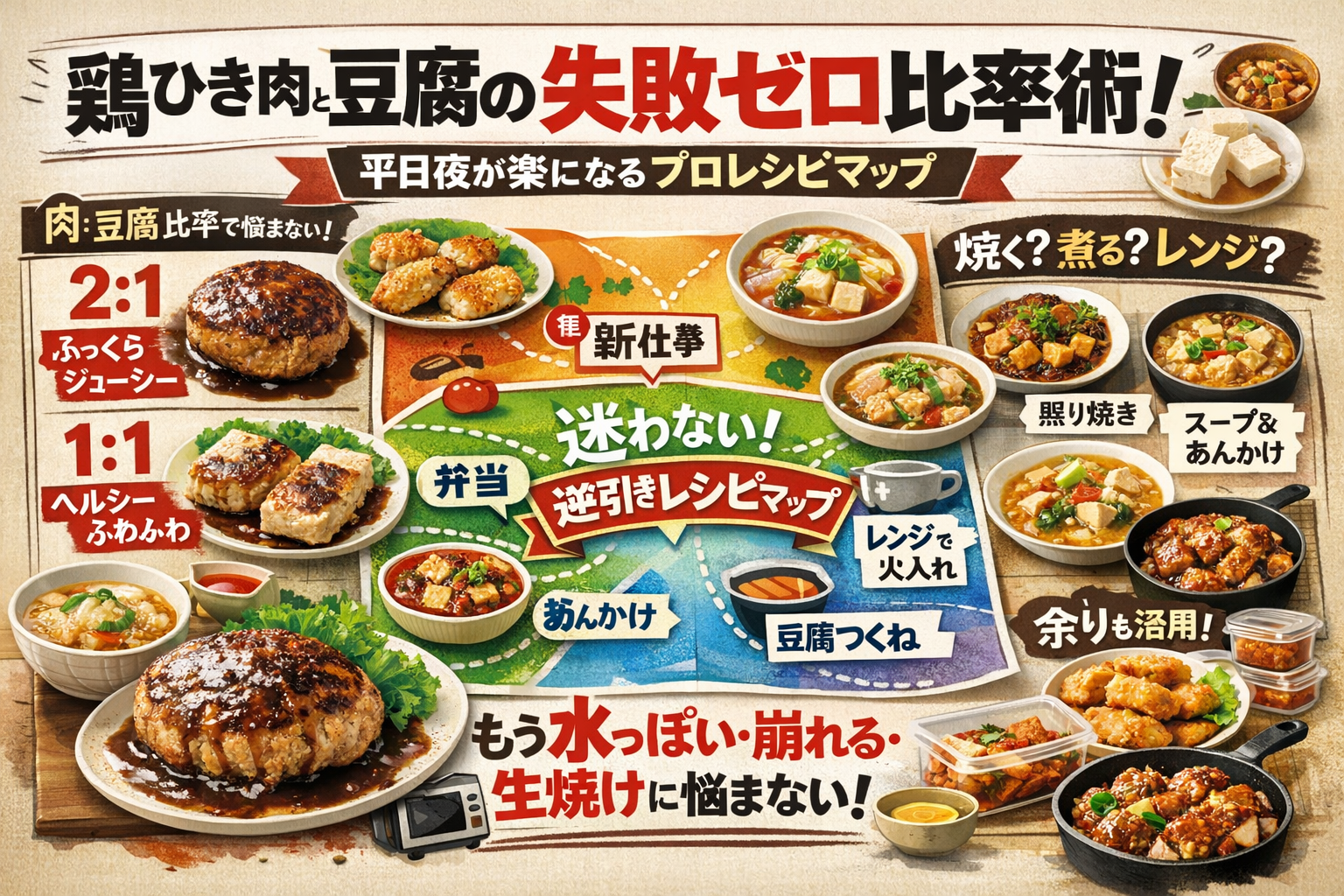 「同じタネなのに、味つけと形を変えるだけで、1週間ローテが組める」──鶏ひき肉と豆腐は、忙しい平日ほど“変身力”が光ります。現場を見ている私の視点で言いますと、下のマップを頭に入れておくだけで献立決めが一気にラクになります。