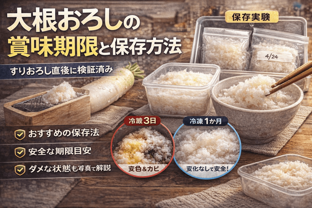 この記事では、冷蔵0〜3日での変化を具体的に押さえつつ、冷凍保存と解凍方法、薬味用か料理用かでの使い分け、市販チルドや冷凍食品との違いまで一気に整理する。鍋・スープ・つゆ・和食おかずなど、よくあるメニューごとに、最適な保存方法と使い切り方も明示するので、「今日の大根おろしをどうするか」と「次からどう仕込むか」を一度で決められる。