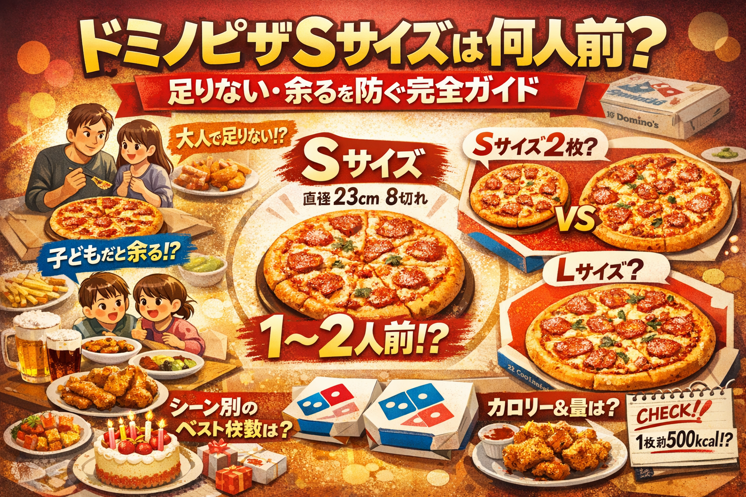 ドミノピザのSサイズは「1〜2人前」と書かれていますが、そのまま信じて注文すると、大人が多い場では足りず、子ども中心の会では余ることがよくあります。原因は、人数だけを見てサイズを決めてしまい、「大人と子どもの比率」「お腹の空き具合」「サイドメニューやケーキの有無」「宅飲みか食事メインか」といった要素を計算に入れていないことです。