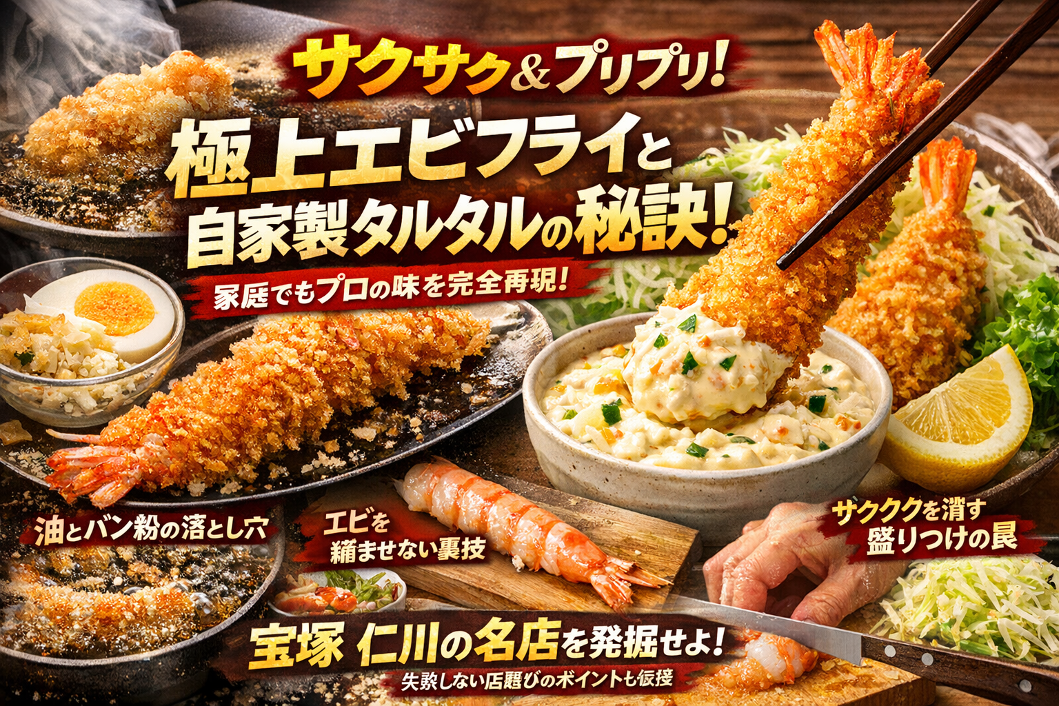 家でエビフライを揚げるたびに、知り合いの料理好きから「衣がはがれた」「タルタルが途中でしんどい」とLINEが来ます。プロとして伝えられるのは、気合や根性論ではなく、油の状態、盛りつけの順番、タルタルの水分と酸味の決め方といった具体的な判断基準です。宝塚や仁川で外食するときにも、写真と口コミのどこを見れば「サクサク&プリプリ」と自家製タルタルの店を選べるのか。その両方を一度整理して言葉にしておきたいと思い、このテーマを書きました。