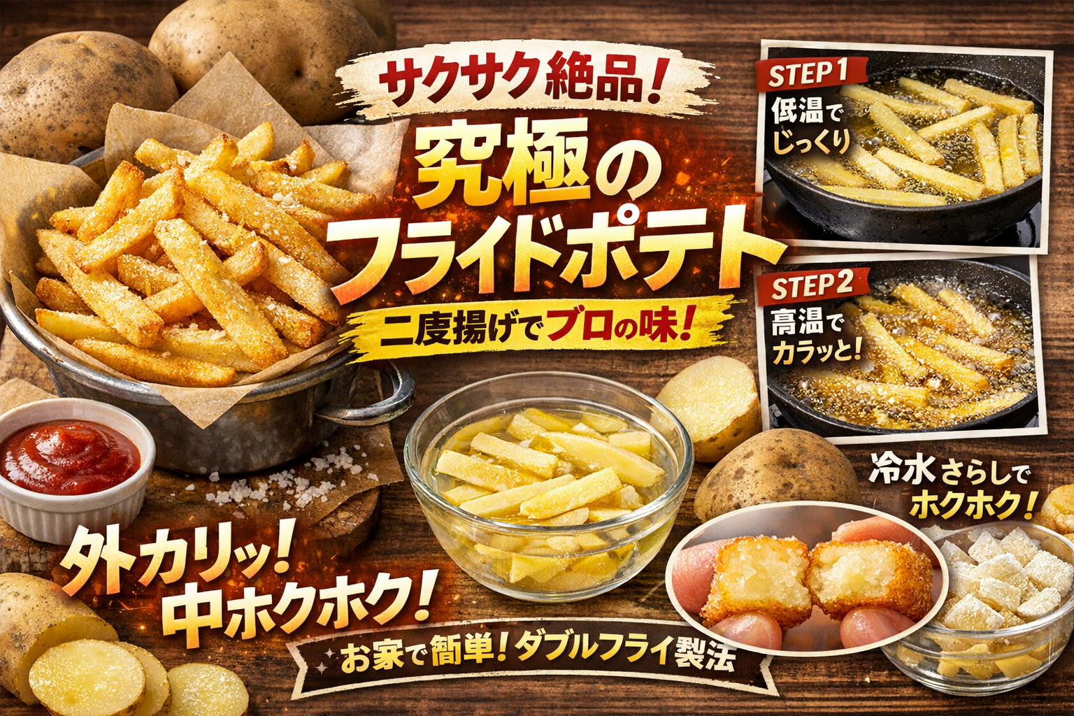 | 構成の前半(原因分析〜基本レシピ〜三大トラブル) | 家のコンロ・鍋・油量でも外食級のカリほくポテトを再現するための、切り方・低温スタート・二度揚げ・味付けタイミングの実務マニュアル | 「レシピどおりなのに失敗する」「素揚げなのにベチャつく」「油がすぐ劣化する」といった、原因不明の失敗ループ |