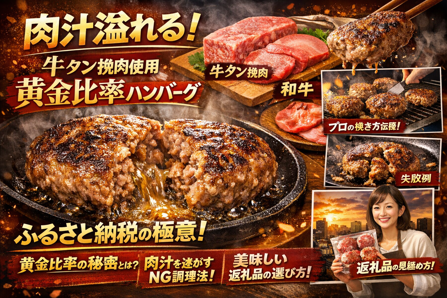 この記事では、牛タン入り黄金比率ハンバーグが現場でどう設計され、なぜ割れや縮み、固さ、生っぽさが起こるのかを料理人の視点で言語化し、どの返礼品を選び、どう焼けば肉汁を溢れさせられるのかまでを一本の線で示します。読み終えたとき、ランキングや口コミに頼った「運任せの寄付」から、狙って当てるふるさと納税に変わります。