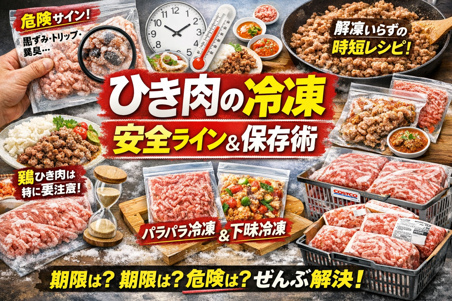 | 前半(やばいサイン〜正しい保存・冷凍・解凍) | ひき肉を冷蔵・冷凍したときの安全期限、冷凍ひき肉の見極め方、パサパサ・臭い・黒ずみを防ぐ冷凍・解凍フロー | 「このひき肉はまだ食べていいのか」「どこまでが危険なのか」が判断できず、毎回検索と不安を繰り返す状態 |