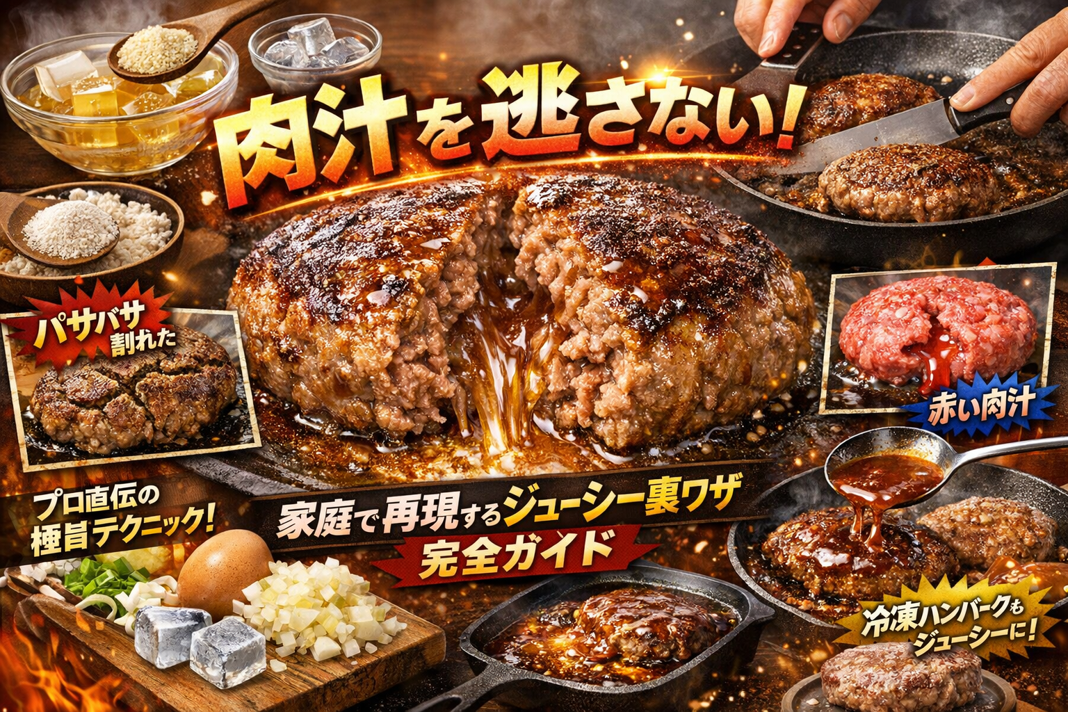 ハンバーグを切っても肉汁があふれず、パサパサだったり、赤い肉汁や透明な汁を見て「これ大丈夫?」と不安になった経験はありませんか。氷やゼラチン、片栗粉、マヨネーズなどテレビで見た肉汁裏ワザを試しても、「肉汁が出ない焼き方」から抜け出せないなら、原因はレシピではなく仕組みの理解不足です。
