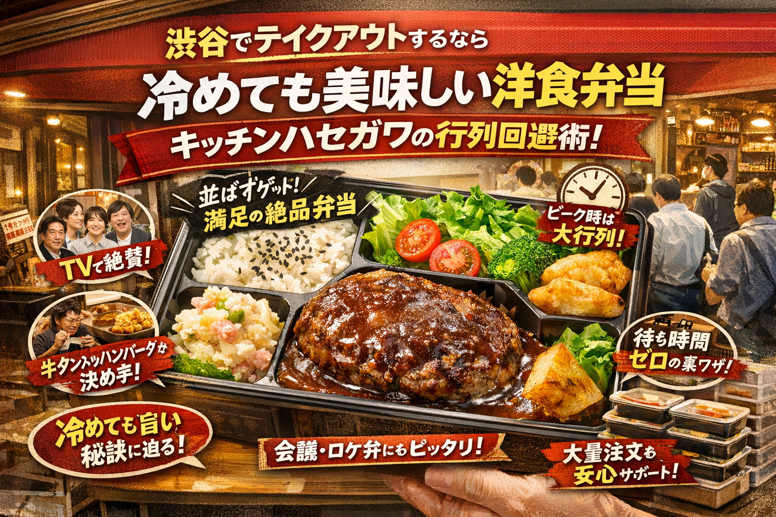 渋谷でテイクアウトするたびに、冷めて固くなったハンバーグや、午後の仕事に響く油っぽい弁当をなんとなく受け入れていないでしょうか。行列必至の「キッチンハセガワ」は、渋谷ハンバーグランチの人気店として知られていますが、本当に差が出るのは冷めてからの洋食弁当のクオリティと、行列を前提にした使いこなし方です。牛タン入り合挽きハンバーグの配合、副菜とサラダ比率、ソースとご飯の組み合わせ次第で、「冷めても美味しい洋食弁当」になるか、単なる持ち帰りランチで終わるかが変わります。さらに、渋谷のピーク帯の待ち時間を読まずにテイクアウトやロケ弁を頼むと、受け取り遅延や品質劣化といった見えない損失が積み上がります。この記事では、キッチンハセガワのテイクアウト基本情報から、行列回避術、弁当に向くメニュー選び、会議・撮影現場で失敗しない大量注文の勘所まで、現場目線で分解します。この記事を読み終える頃には、「渋谷でテイクアウト!冷めても美味しい洋食弁当」を、待ち時間のストレスなく最大限に活かす具体的な手順が手元に残ります。
