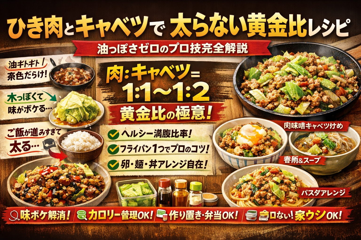 | 構成の前半(失敗理由〜黄金比〜基本レシピ〜夜21時以降の設計) | 油っぽさ・味ボケ・茶色地獄を避けつつ、太りにくい「肉:キャベツ」と調味・火加減の基準を持てる | 「レシピ通りなのにおいしくない・太る・見た目が安っぽい」といった再現性の低さ |