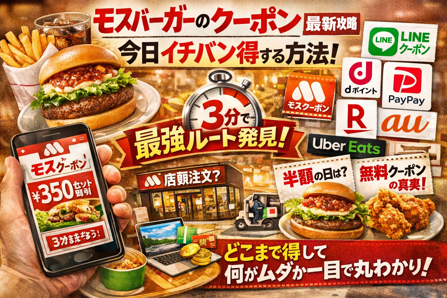 店頭・ネット注文・デリバリー別に、モスアプリクーポン、LINEクーポン、dポイント、ドコモ、PayPay、楽天、au、モスチキンチケットまでを整理し、「どこまで追えば十分か」「どこから先は時間の無駄か」を線引きします。