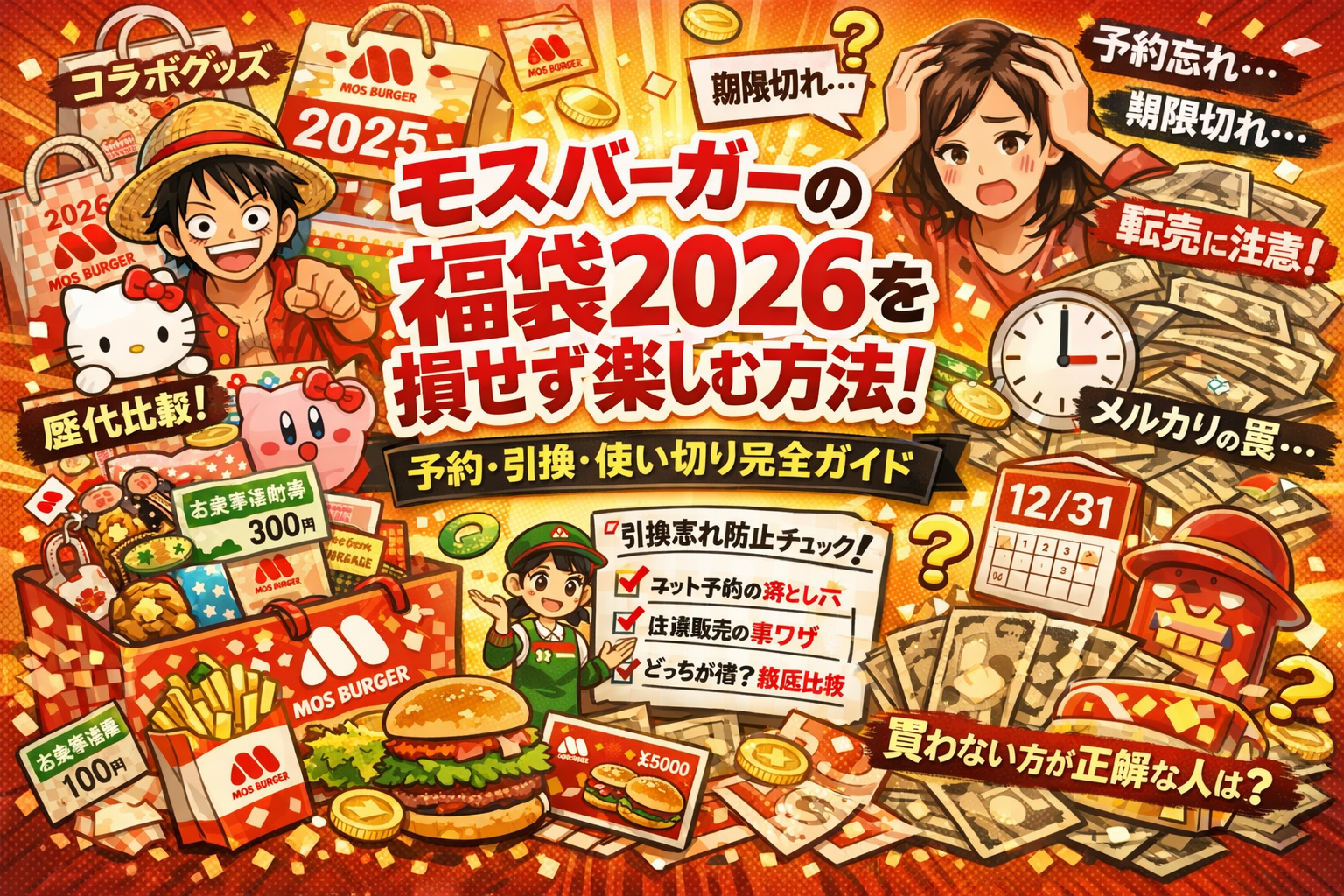 モスバーガーの福袋は、「買えたかどうか」よりも「使い切れたかどうか」で手元に残る現金が決まります。2026年版モスバーガー 福袋も、予約期間や店頭販売の有無、ワンピースやサンリオとのコラボ中身だけ追いかけていると、気づかないうちに三重の損失が積み上がります。
