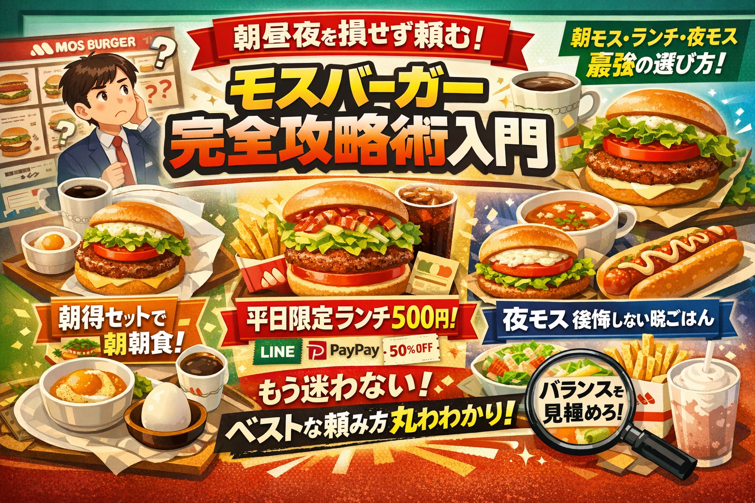 同じモスバーガーでも、朝モス・平日限定ランチセット・夜モスで「得な組み合わせ」はガラッと変わります。メニュー表だけ追っていると見落としやすいポイントを、現場でセット構成を考えてきた業界人の目線で整理します。