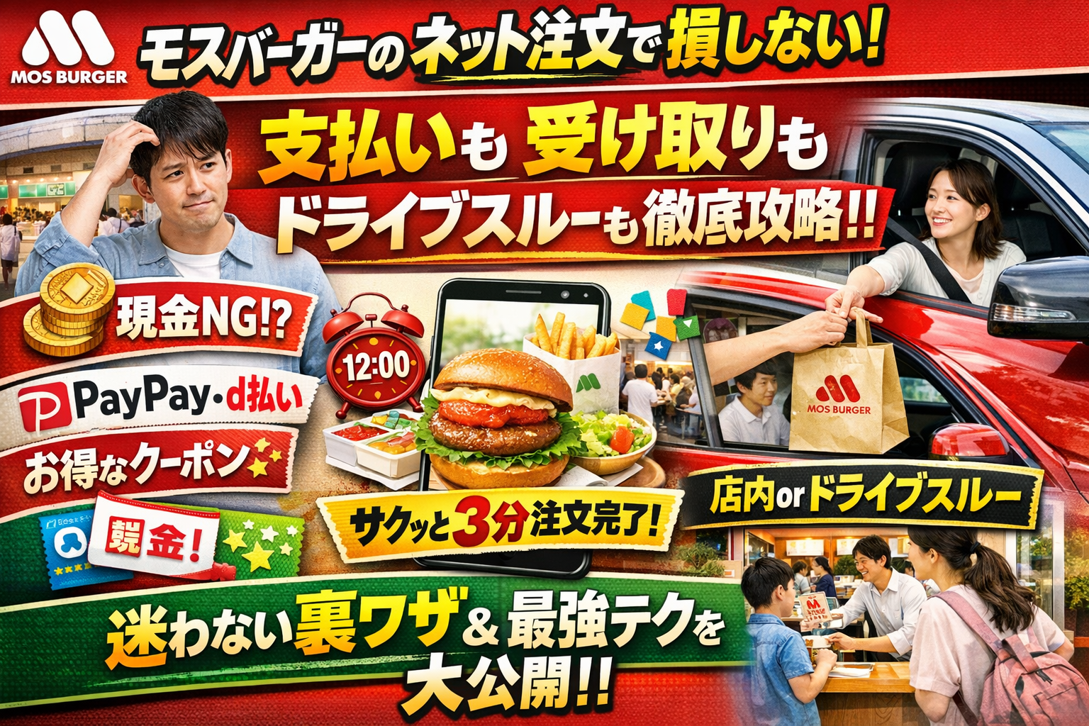 本記事では、モスバーガーのネット注文を「注文方法」「支払い方法」「受け取り動線」「ピーク時間」の4つに分解し、現場オペレーションの視点から、最もモタつかず・損をしない手順だけを抽出しました。モスのネット注文 支払い方法の選び方から、店内で食べる時の席確保、ドライブスルー受け取り、クーポンの優先順位まで、一度読み切ればそのまま実務マニュアルとして使える内容です。