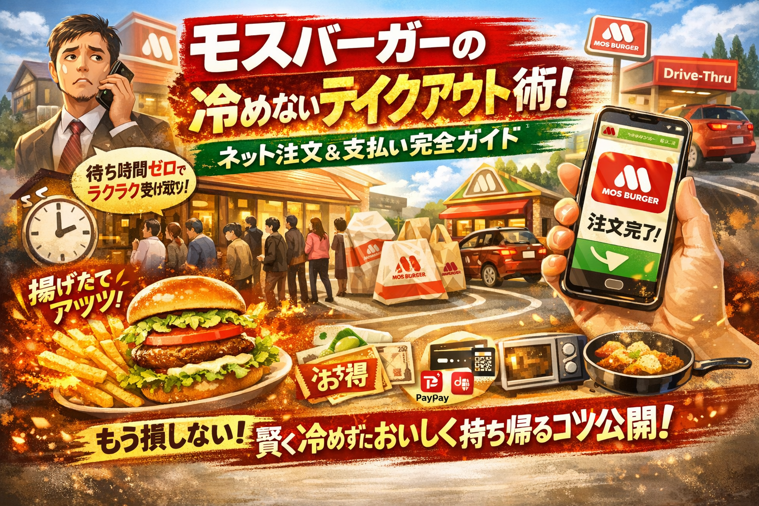 仕事終わりに「モスバーガーをテイクアウトして家族に持ち帰ろう」と決めても、店舗で並び、ポテトは冷め、セットの値段もよく分からないまま会計を済ませていないでしょうか。テイクアウトのやり方を知らないまま「とりあえず店舗へ行く」選択が、待ち時間と味とお金のすべてで損を生んでいます。