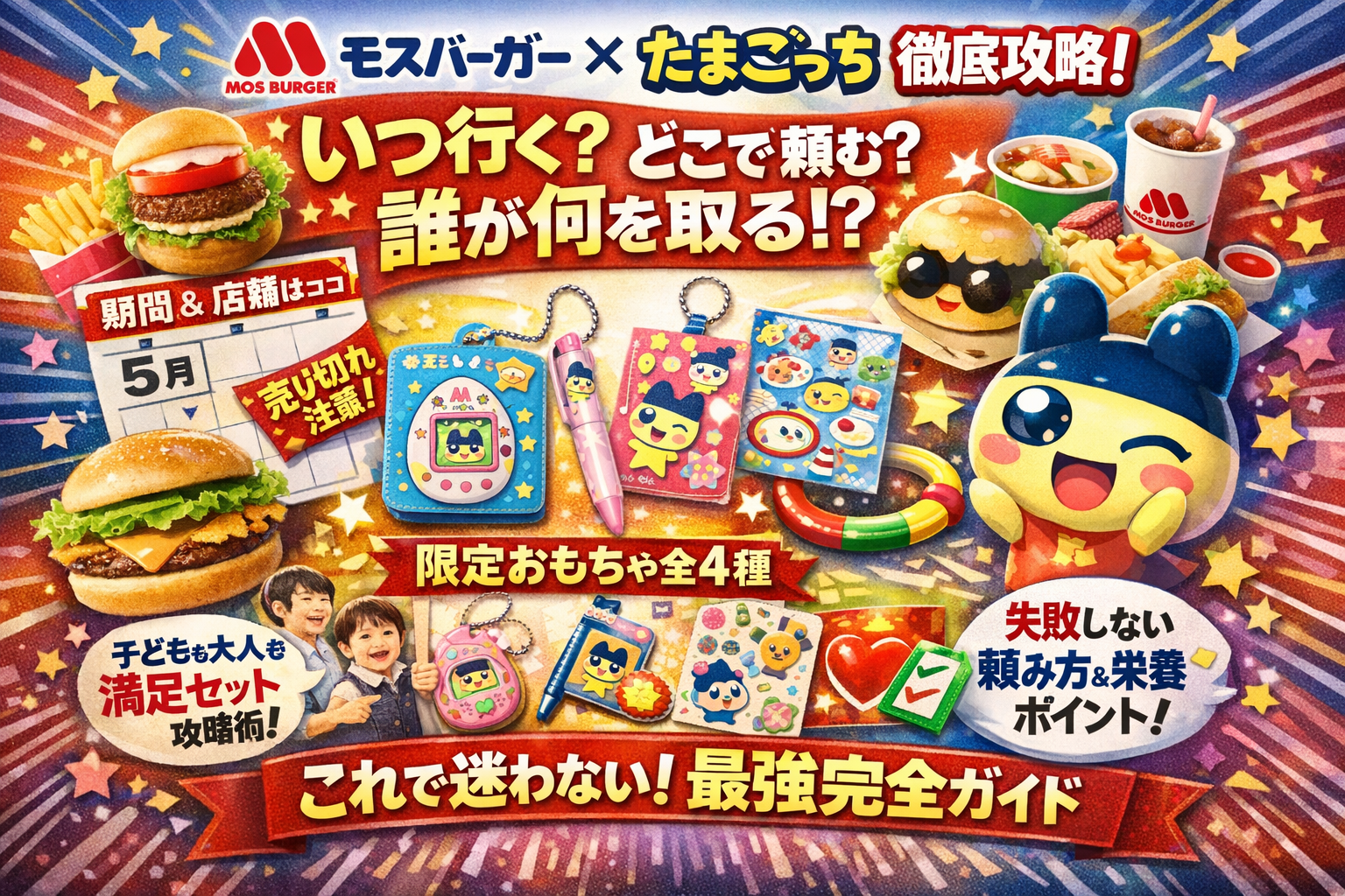 本記事は、モスバーガー×たまごっちコラボについて、いつからいつまで/対象店舗/モスワイワイセットと低アレルゲンセットの違い/おもちゃ4種(パスケース・ボールペン・シール・わなげあそび)の中身までを一気に整理したうえで、「どの時間帯に行き」「どの組み合わせでセットを頼めば」「誰がどのおもちゃを取るか」まで踏み込んで設計します。