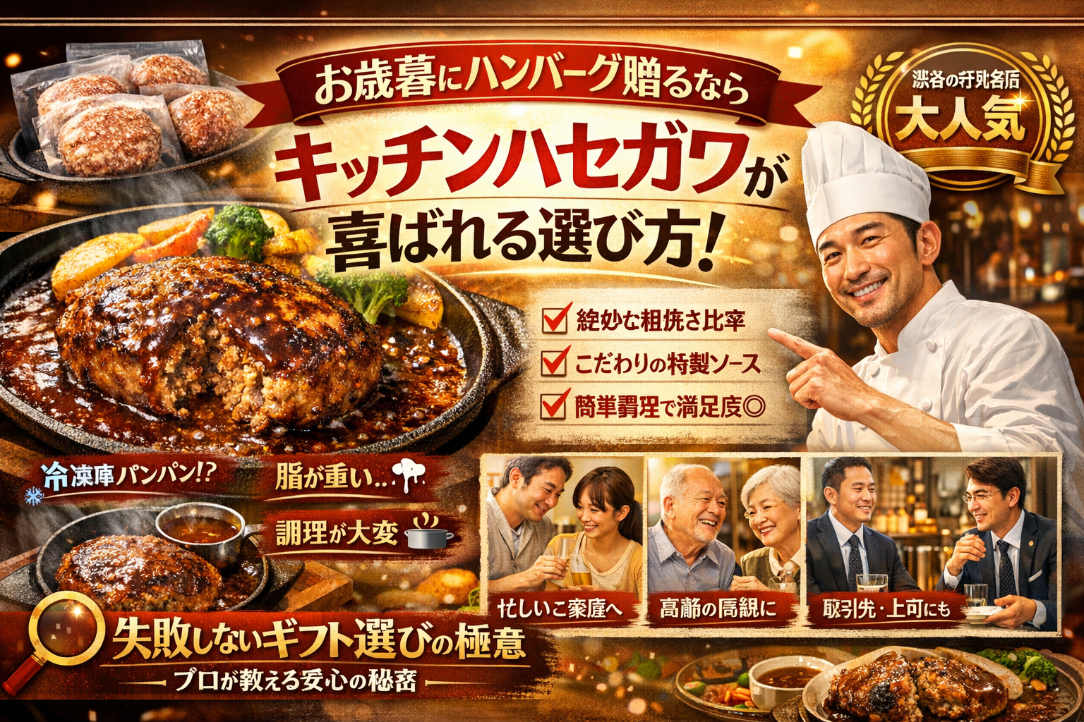 渋谷や神泉エリアの行列店の名前が頭に浮かぶと、「あの味をそのまま歳暮の贈り物にできたら」と思いますよね。でも、人気とギフト適性は別物です。厨房でハンバーグを焼いてきた私の視点で言いますと、大事なのは「ブランド名」ではなく、中身の設計と家庭での再現性です。