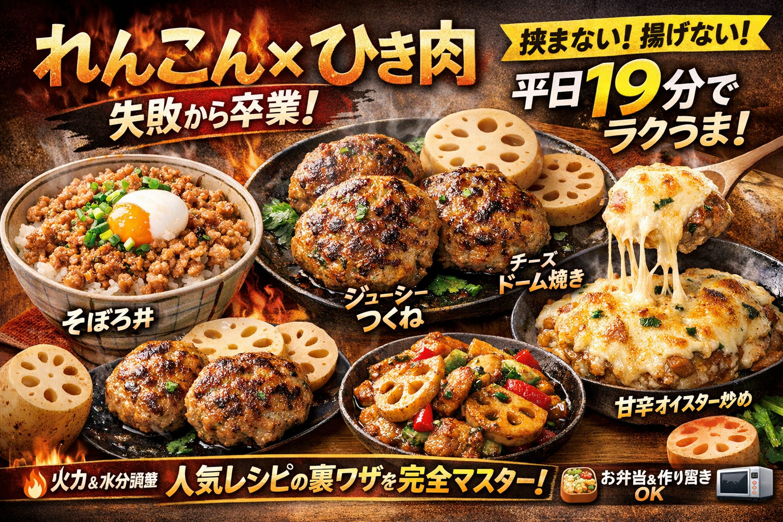 平日の19時前、冷蔵庫にれんこんとひき肉はあるのに、「れんこん ひき肉 レシピ 人気 簡単」を検索しては、固い・ベチャつく・はさみ焼きがはがれる…。この繰り返しで、あなたは時間と食材を静かに失っています。問題はレシピそのものよりも、「強火で一気に炒める」「れんこんは長く水にさらす」「片栗粉を増やせばはがれない」といった古い基本に縛られていることです。家庭用コンロとフライパン、子どもがいる平日の現実では、この常識がむしろ失敗率を上げています。