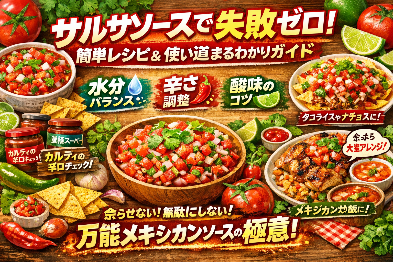 市販のサルサソースを買ってみたものの「水っぽい」「タコス以外の使い道が思いつかない」「子どもには辛すぎて余る」。この状態を放置すると、せっかくのソースも時間も食品費も、静かに目減りしていきます。実は、多くの「サルサソース レシピ」や一般的な「サルサソースとは」の説明だけでは、肝心の水分設計や辛さ調整、市販品の選び方と使い切り方までは届いていません。