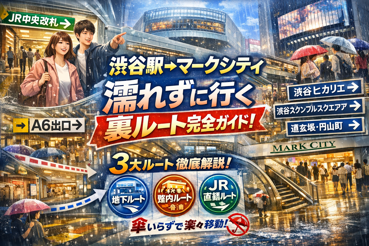 本記事は、渋谷ダンジョン攻略を前提にした「雨の日専用ルート」だけを抽出し、JR山手線や埼京線、東横線や半蔵門線、井の頭線など路線別に、マークシティ直結ルートと「しぶちか」「渋谷マークシティ4階通路」を使ったほぼ濡れない動線を整理します。さらに、マークシティから渋谷ヒカリエや渋谷スクランブルスクエア、渋谷スカイ、渋谷フクラスへのつなぎ方、道玄坂上や円山町まで傘を開く時間を最小化する歩き方まで一気通貫で押さえます。