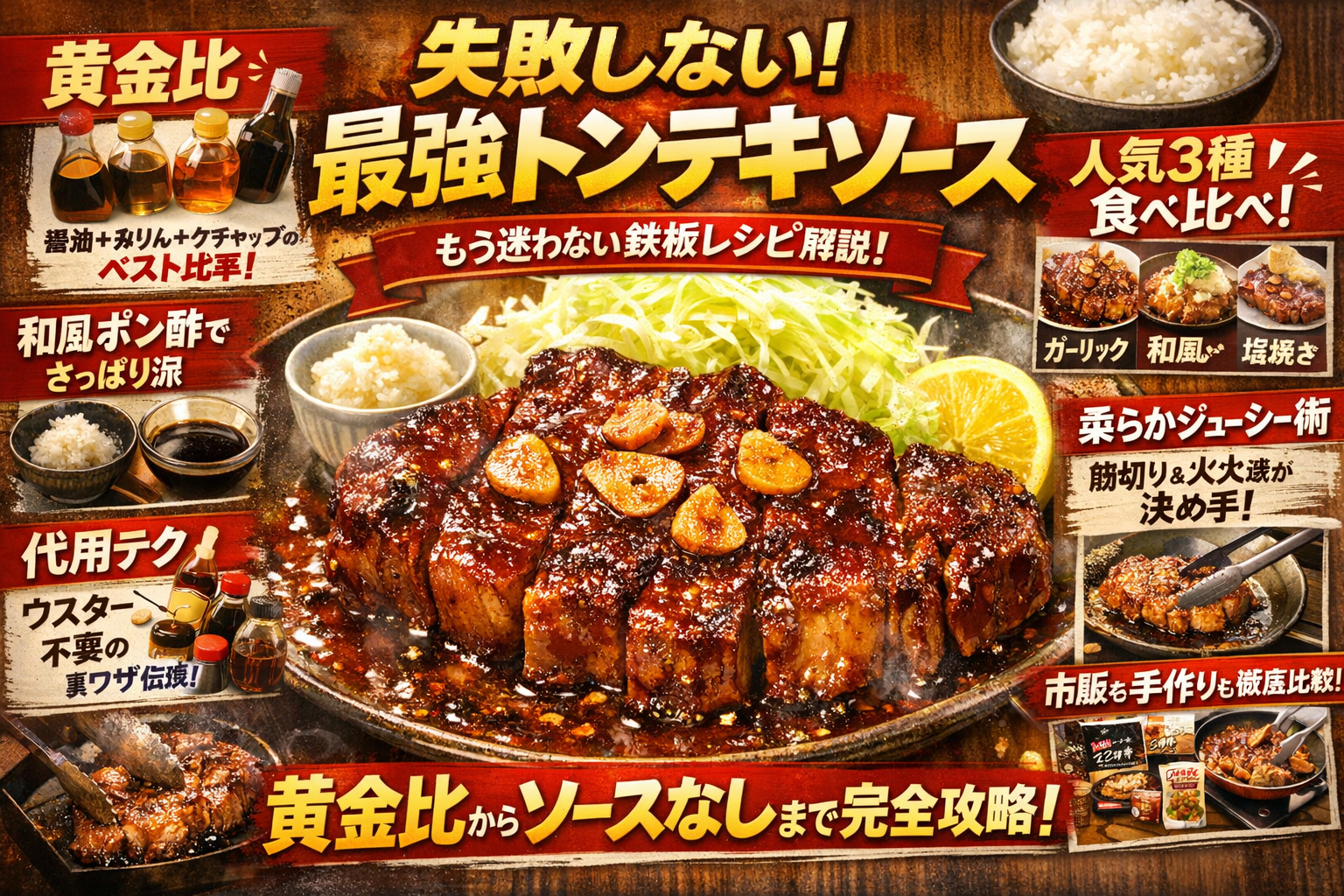 トンテキは「豚肉を焼いてソースをかけるだけ」の料理に見えて、実はソースの黄金比と火入れを外すだけで、固い・パサパサ・油っぽい・味が薄いという残念なおかずに変わります。家にある醤油やみりん、ケチャップ、ウスターソースで何となく作っているなら、そのたびに味を賭けにしているのと同じです。この記事では、甘辛ニンニク醤油の基本トンテキソース黄金比から、和風ポン酢や大根おろし、ガーリックバター醤油、市販ソース活用、さらにはソースなし・塩トンテキまでを1つの基準軸で整理します。ウスターなしでも破綻しない代用テク、フライパンの火加減とソース投入のタイミング、キャベツとライスに一番合う味の濃度、翌日も柔らかい人気レシピ級の段取りまで、現場の料理人が実務として使う考え方に落とし込みました。「トンテキのタレ黄金比」を暗記するのではなく、甘め・ご飯が進む味・さっぱり和風を狙って作り分けられる状態になりたいなら、この数分の読み飛ばしがそのまま毎回の食卓の損失になります。続きを読めば、今日の一枚から「もう迷わないトンテキソース」が決まります。