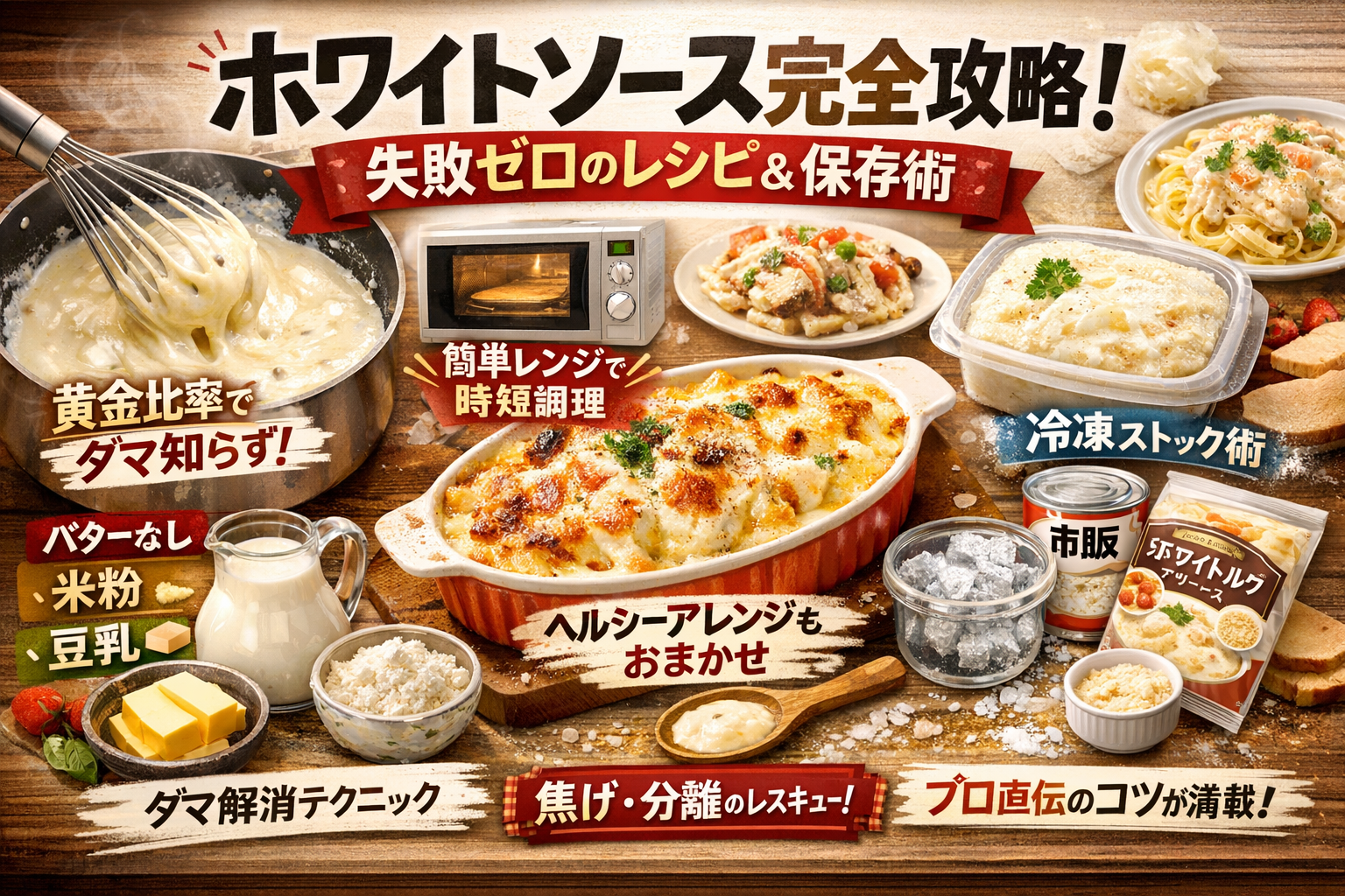 ホワイトソースを作るたびにダマや焦げが出て、結局「市販でいいか」とあきらめていないでしょうか。実は失敗の原因は腕よりも、黄金比率や火加減、鍋とレンジの使い分けを知らないことにあります。本記事では、牛乳とバターと小麦粉の基本のホワイトソースの作り方から、レンジで作る一人分レシピ、バターなし・米粉・豆乳のヘルシーアレンジ、グラタンやドリア、パスタへの展開までを一気に整理します。さらに、ダマや分離のその場での復活方法、ホワイトソースの冷凍保存と解凍、余ったソースの「ちょっとだけ」活用、市販ホワイトソースとのハイブリッド運用まで、家庭では見落としがちな実務のツボをプロの厨房目線で解説します。「ホワイトソース レシピ 簡単」「ホワイトソース レンジ」「ホワイトソース 市販」で何度も検索を繰り返してきたなら、ここで一度すべてを体系的に押さえた方が時間も食材も得をします。今日のグラタンだけでなく、明日以降の平日ごはんが確実に軽くなる設計図として、最後まで読み進めてみてください。