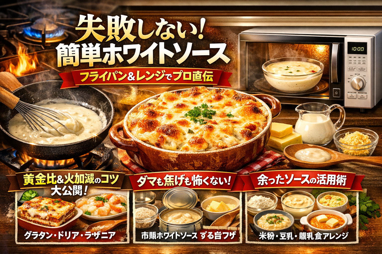 ホワイトソースのレシピを検索するたびに「簡単」「失敗しない」と書いてあるのに、実際はダマだらけ、シャバシャバ、または重すぎてグラタンが残る。この繰り返しは、単に腕の問題ではなく、火加減と配合と量を一括で語らない一般的なレシピ構造そのものが欠陥だからです。